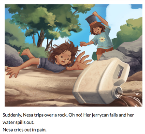 1. What happens after Nesa spills her water?